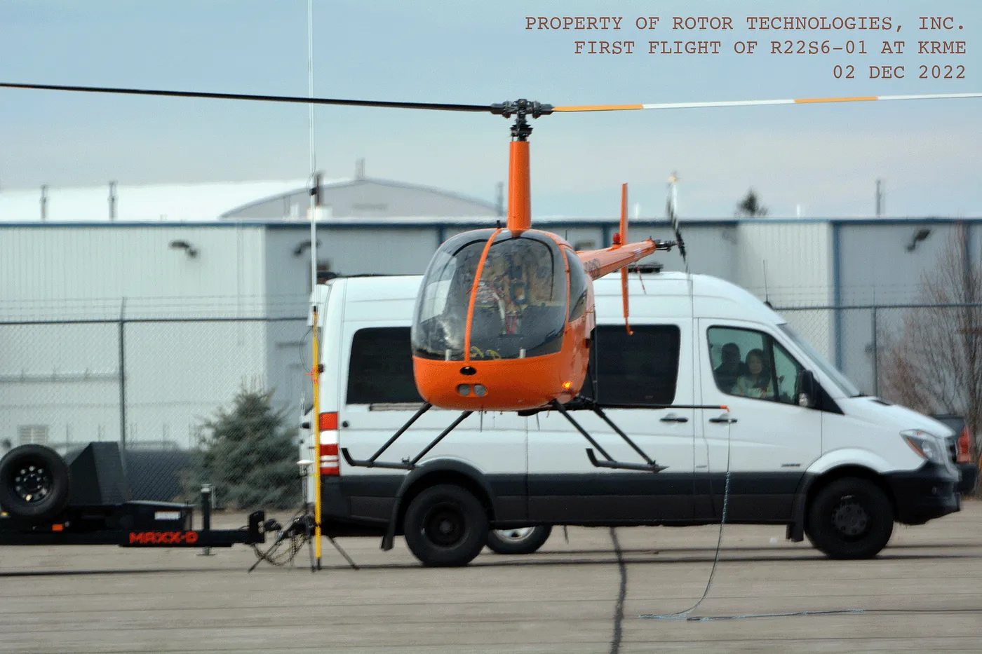 The initial flight on 2 December, 2022 verified the functioning of Rotor’s flight controls, engine controls, and teleoperations systems. The pilot was located in a ground control station and directly manipulated the flight controls throughout the flight, providing real-time inputs to stabilize the helicopter. Communications from the helicopter and control station were transmitted over multiple digital radio links, while a wired tether provided a fail-safe backup.